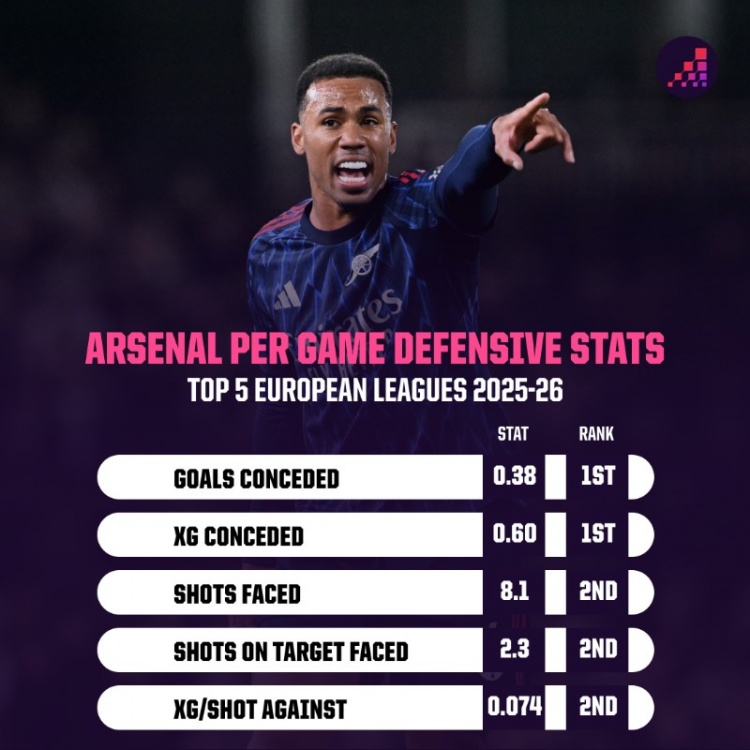 铁壁铜墙!阿森纳本赛季场均丢球等5项看护关节数据均列英超前二