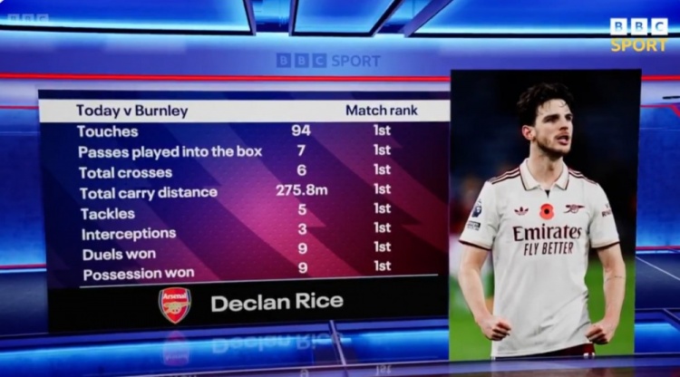 11月2日讯 英超第10轮比赛,赖斯破门,阿森纳客场2-0打败伯恩利,据BBC统计,此役赖斯触球、抢断、约束等多项数据全场居首。