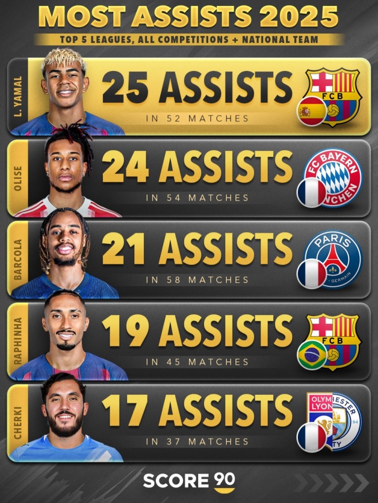 本年五大联赛球员助攻榜:亚马尔25助居首,奥利塞24助次席