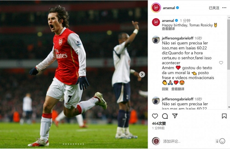 阿森纳官方社媒晒出罗西基着力球队时候的像片,配文:“诞辰得志,罗西基。”