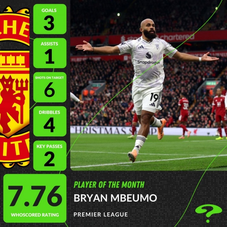 曼联新援姆伯莫当选,他在本月英超3场比赛孝敬3球1助攻,匡助红魔获取3连胜。