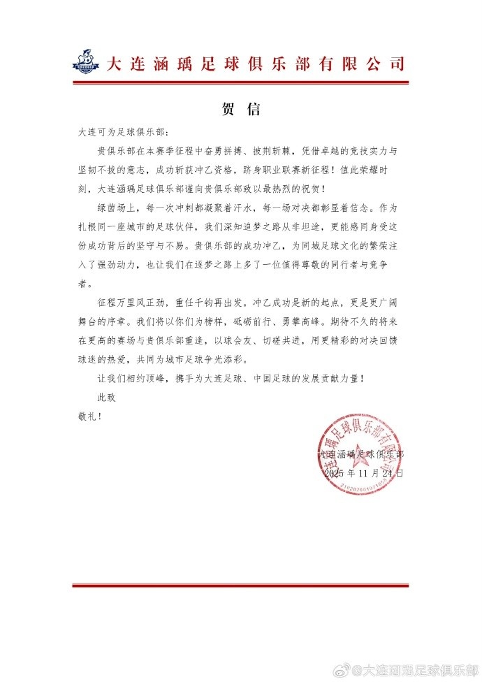 11月24日讯 中乙新军大连可为官方发文,感谢同城球队贺信。