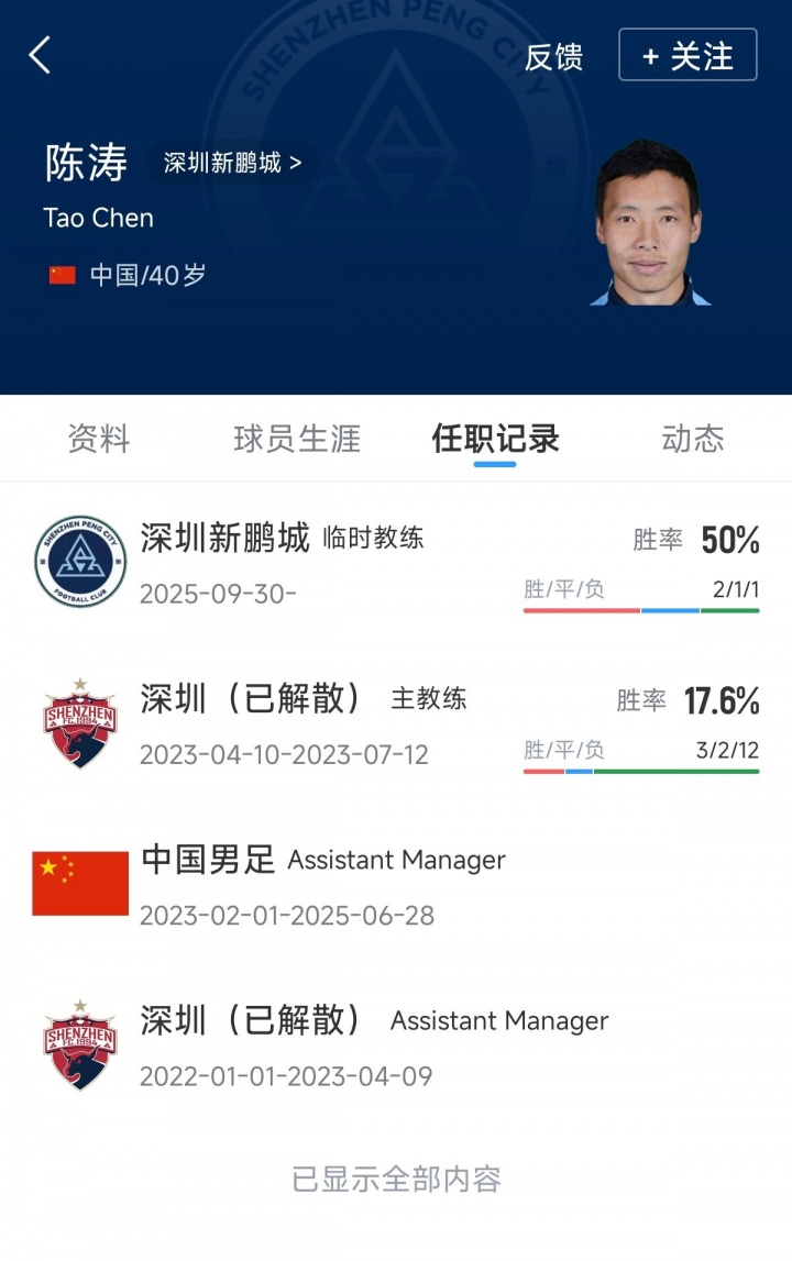 转正!官方:40岁陈涛适宜担任深圳新鹏城一线队主教师