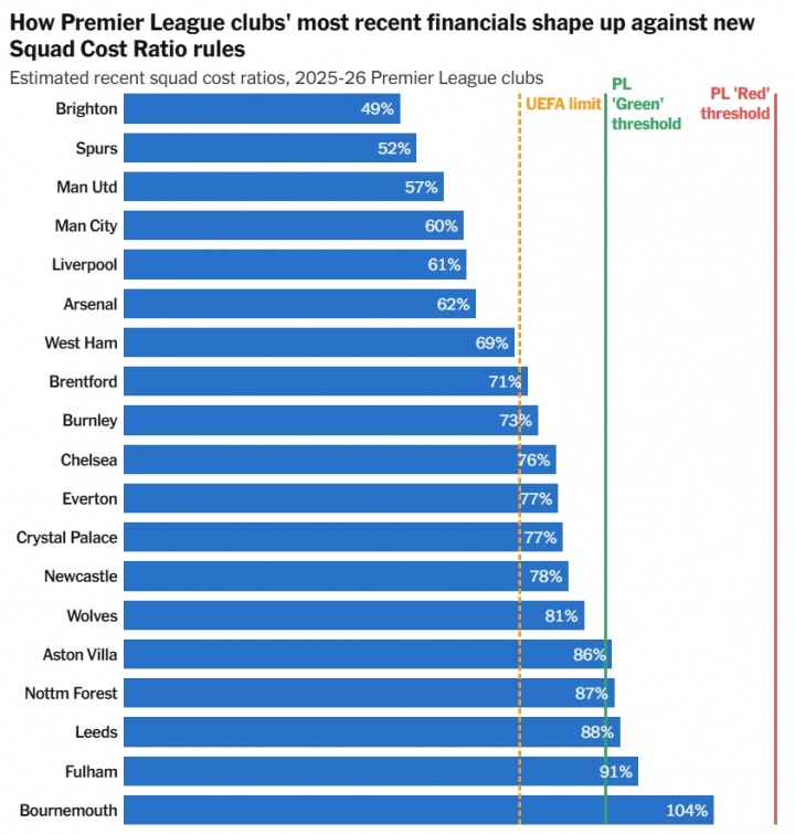 布莱顿以49%的比例清晰最好,财务状态最为健康,热刺和曼联紧随后来。可是,不少俱乐部面对合规压力,维拉、诺丁汉丛林等队已率先欧足联设定的放荡线,而伯恩茅斯更所以104%的比例高居榜首,以至冲突了英超联赛设定的“绿色”安全阈值,显现出较高的财政风险。