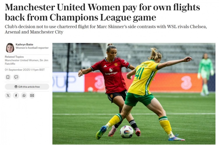 电讯报:曼联让女足私费购买欧冠客场返程机票,部分球员很盛怒