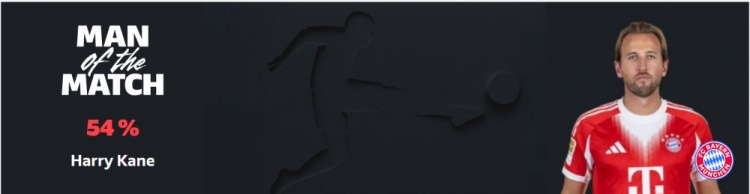 此役凯恩2射1传,匡助拜仁取胜,他获取54%的选票,当选全场最好球员。