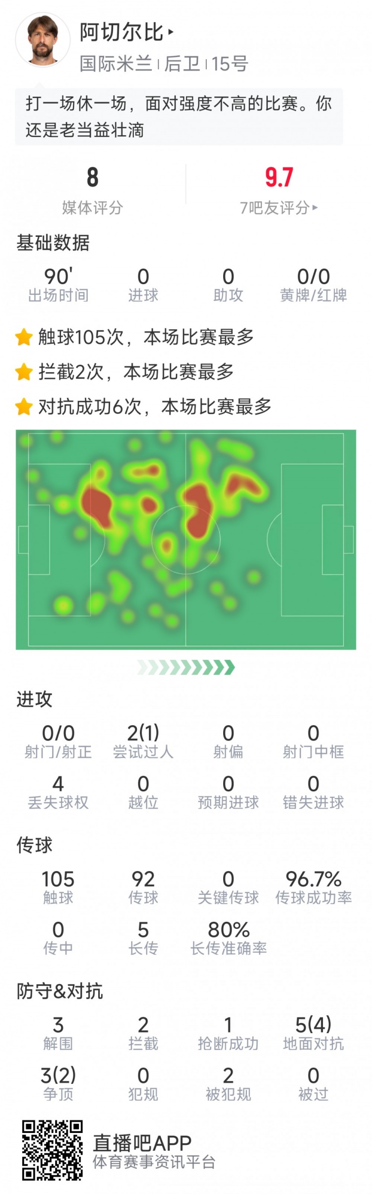 10月1日讯 在本轮欧冠,国米3-0大捷布拉格斯拉维,以下为阿切尔比本场数据: