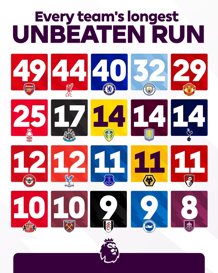 英超官方盘货了联赛中每支球队现在的最长不败记录,并提问:“你合计阿森纳的记录会有被防碍的那一天吗?”