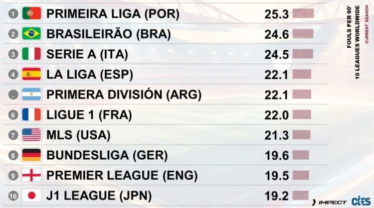 寰宇联赛每90分钟犯规次数排名:葡超25.3次居首,英超19.5循序9