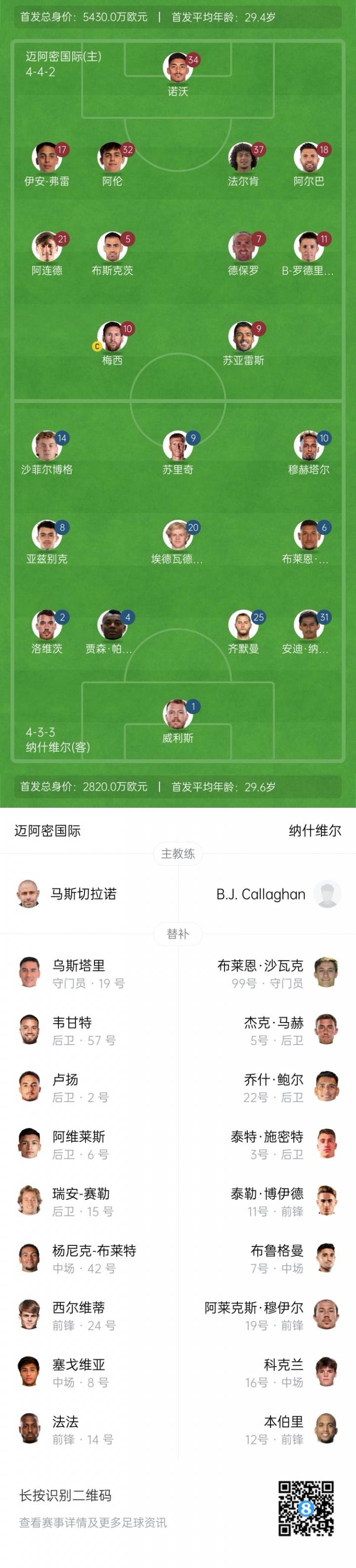 迈阿密国外首发:34-诺沃、17-伊安·弗雷、37-法尔肯、32-阿伦、18-阿尔巴、21-阿连德、7-德-保罗、5-布斯克茨、10-梅西、11-B·罗德里格斯、9-苏亚雷斯