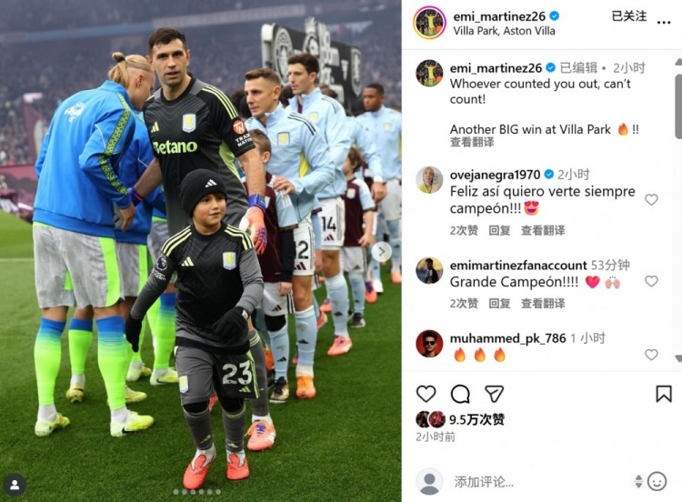 维拉门将马丁内斯也在赛后晒出本场像片,配文写谈:“不管谁看低你,王人不算数。在维拉公园球场又一场进攻见效!”