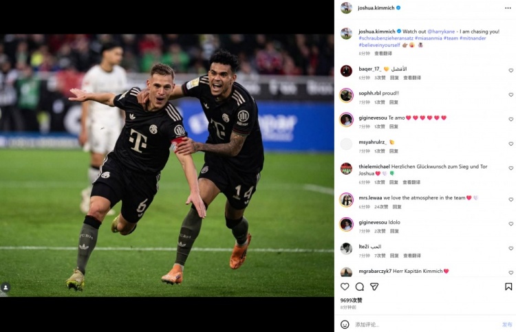本场比赛基米希打入赛季首球,他也在社媒晒出庆祝照,配文嘲谑说念:“凯恩留心了,我要追上你了!”