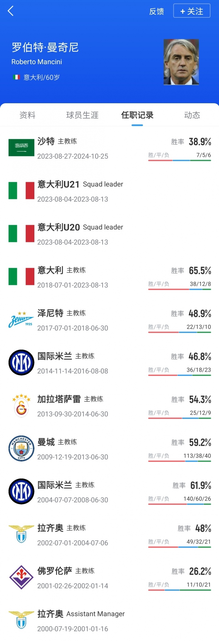 2023年8月,曼奇尼因与意大利足协矛盾一霎文告离职,随后他收受了沙特国度队的邀约,签约至2027年,年薪2500万欧。