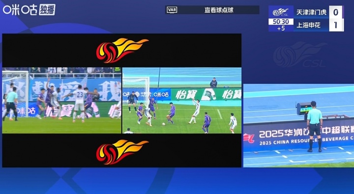 上半场补时阶段,王献钧禁区内手球,裁判经VAR辅导后回看改判点球,吴曦点射破门,申花2-0逾越津门虎。