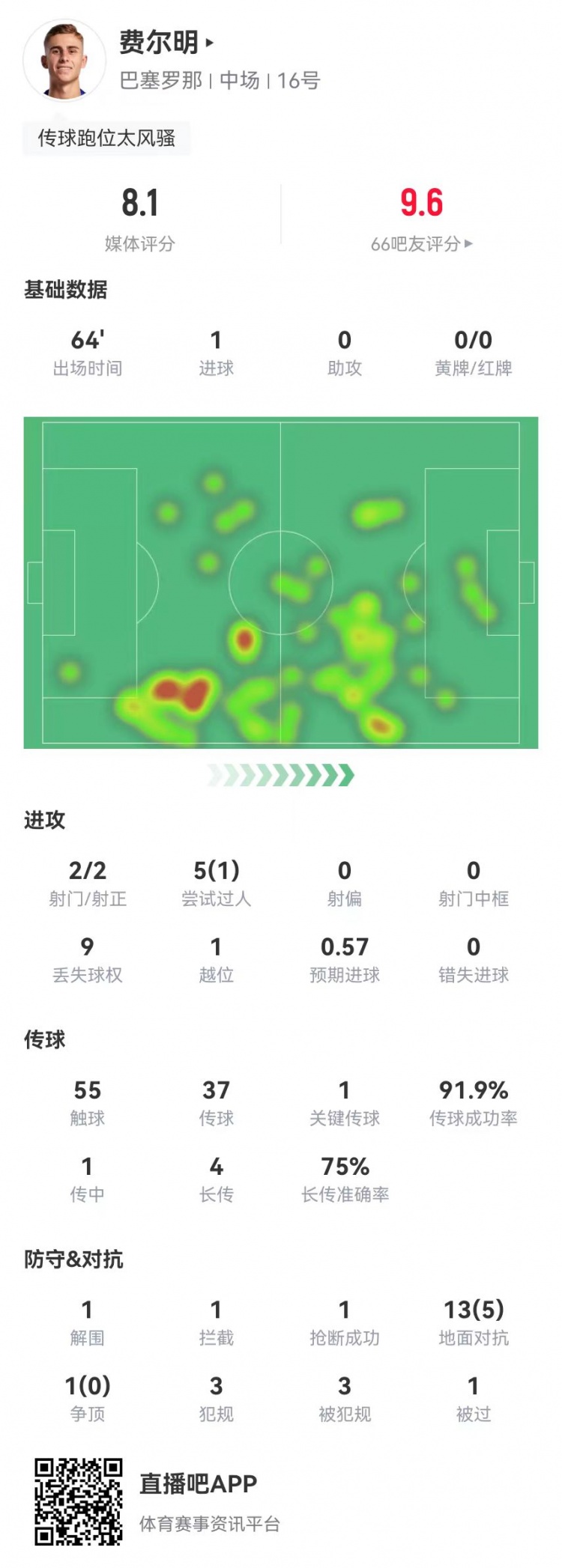 11月23日讯 巴萨在本轮西甲3-0提升毕尔巴鄂竞技,费尔明本场数据如下: