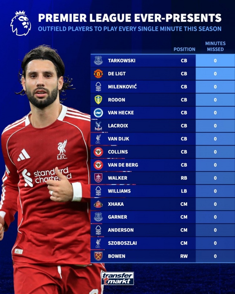 12月1日讯 英超照旧战罢13轮,《转会市集》统计了本赛季于今一分钟王人未缺席的全勤非门将球员,系数16东谈主:
