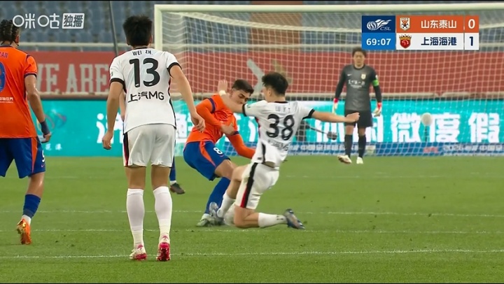 04月17日讯 中超第6轮,山东泰山vs上海海港,赛事 第69分钟,卢永涛踩踏马德鲁加+后者痛苦倒地,裁判 出示警告