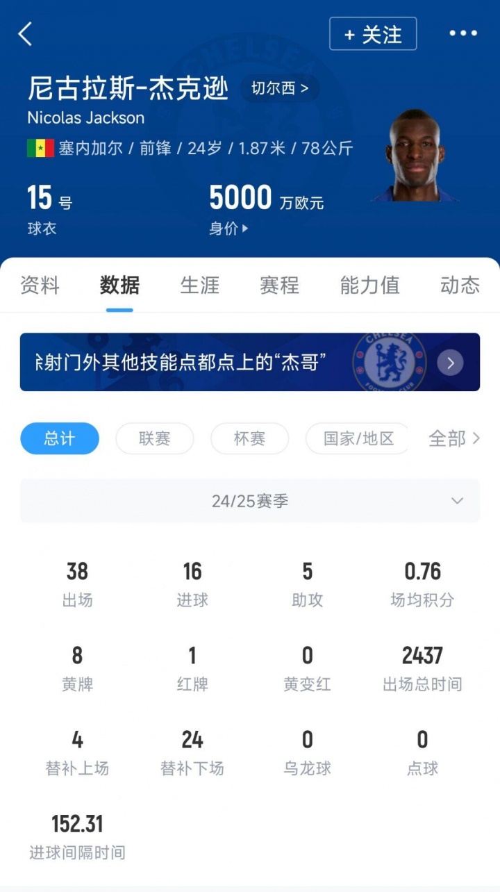 现年24岁的塞内加尔国脚杰克逊身价5000万欧,上赛季为切尔西出战38场得益16球5助。