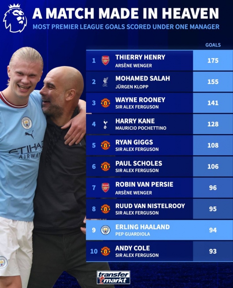 英超归并主帅治下球员进球榜:亨利175球居首,萨拉赫155球