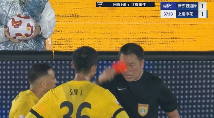 历程VAR辅导,主裁在场边不雅看回放,决定改判红牌,孙捷被平直罚下,申花多打一东谈主。