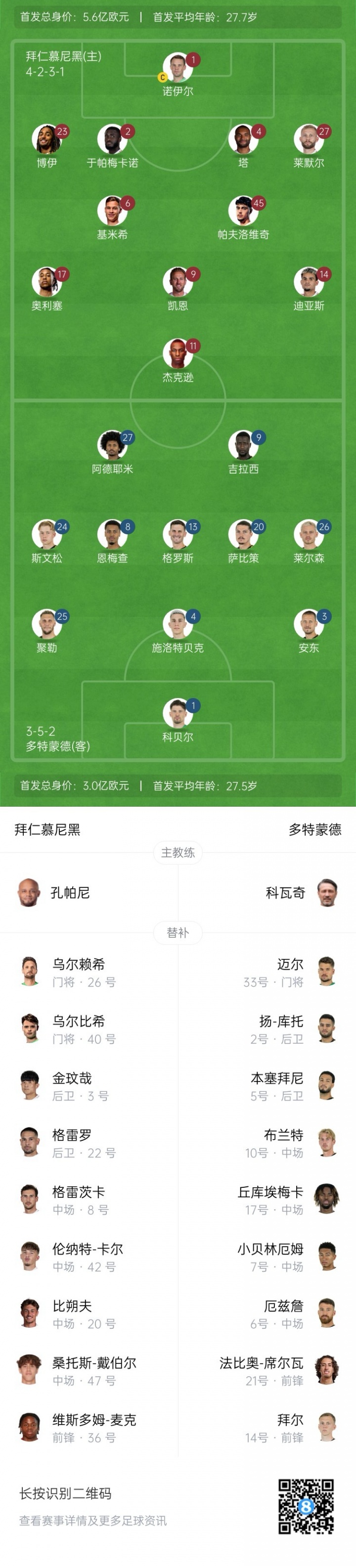 拜仁慕尼黑首发:1-诺伊尔、2-于帕梅卡诺、4-塔、23-博伊、6-基米希、27-莱默尔、45-帕夫洛维奇、9-凯恩、11-杰克逊、14-迪亚斯、17-奥利塞