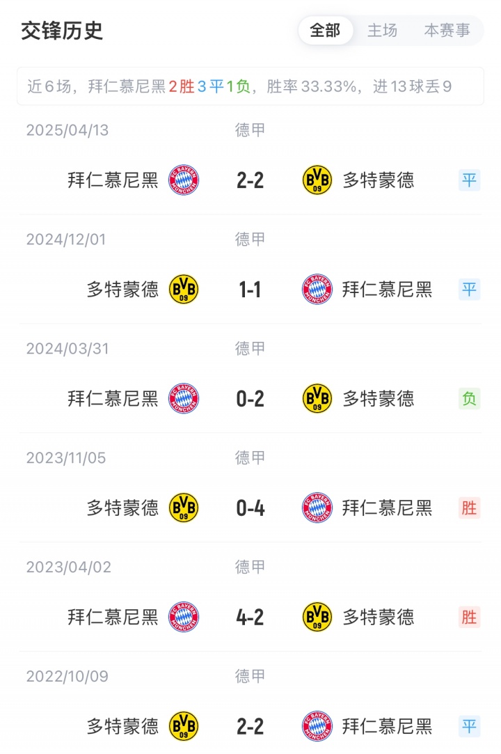 拜仁联赛6轮全胜积18分位居德甲榜首,开季各赛事已获10连胜;多特联赛4胜2平积14分,开季各赛事9场比赛相同沿途保抓不败。拜仁对阵多特已3场不堪(2平1负)。
