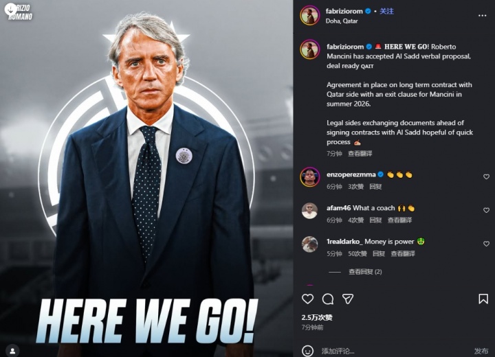 11月11日讯 名记罗马诺用标记性和“here we go!”说明,意大利籍主教悔曼奇尼将持教卡塔尔俱乐部阿尔萨德。