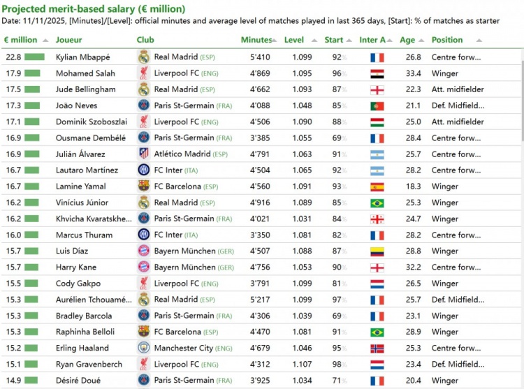 CIES球员应得最高年薪名次:姆巴佩2280万欧居首,萨拉赫位居次席