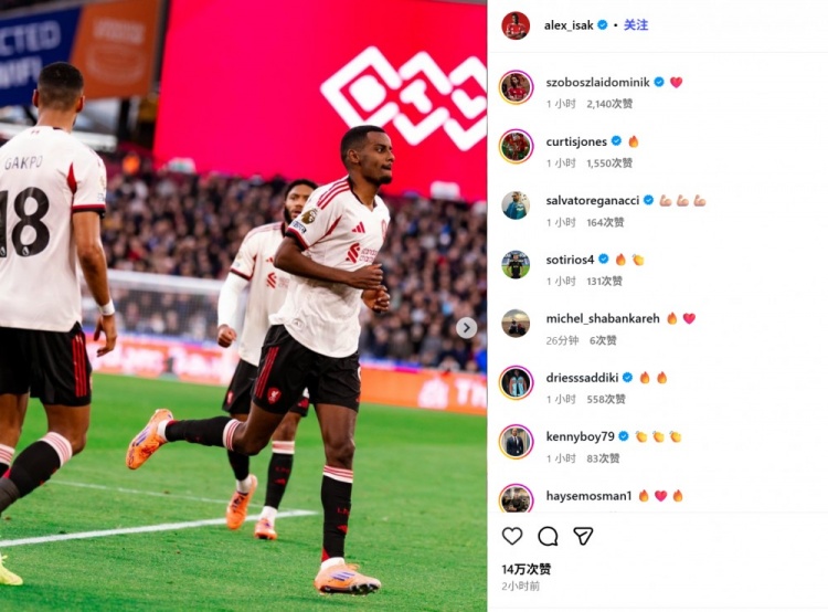 伊萨克也在赛后通过社媒晒出了我方的比赛照,但并未附加笔墨实质。索博斯洛伊、琼斯等队友现身驳倒区留住形势标识以作饱读舞。