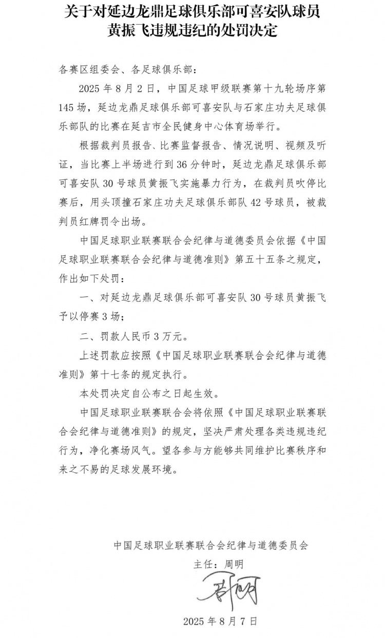 8月2日中甲第19轮延边龙鼎主场对阵石家庄功夫,比赛第36分钟,延边龙鼎球员黄振飞在裁判吹停比赛后,用头顶嘴对方球员,被红牌罚下。中足联对延边龙鼎球员黄振飞赐与停赛3场,罚金东谈主民币3万。