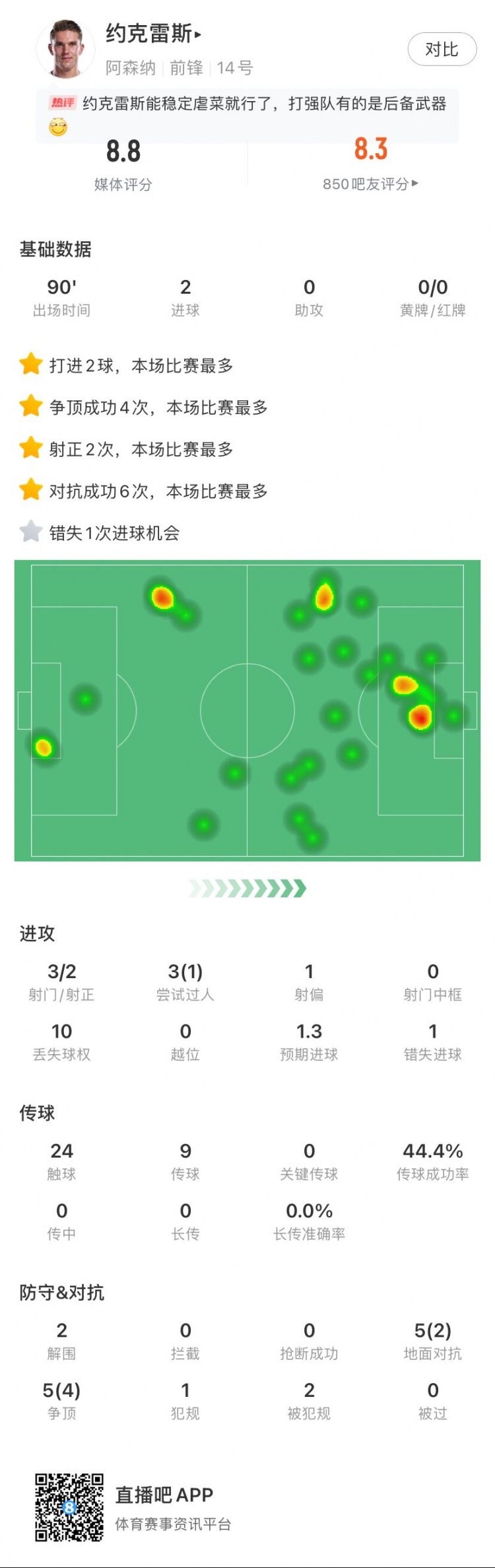 施展我方!约克雷斯本场数据:2进球,1次过东谈主,1次错失进球契机