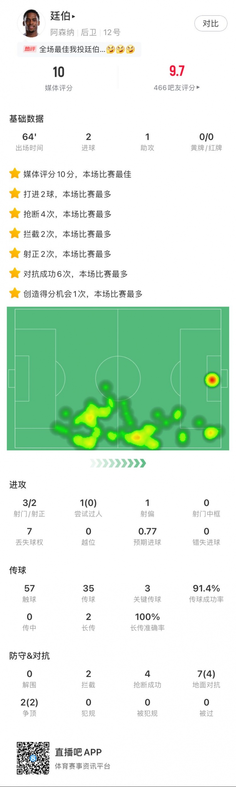 太强!廷伯本场数据:2射1传+4次抢断,评分10分全场最高