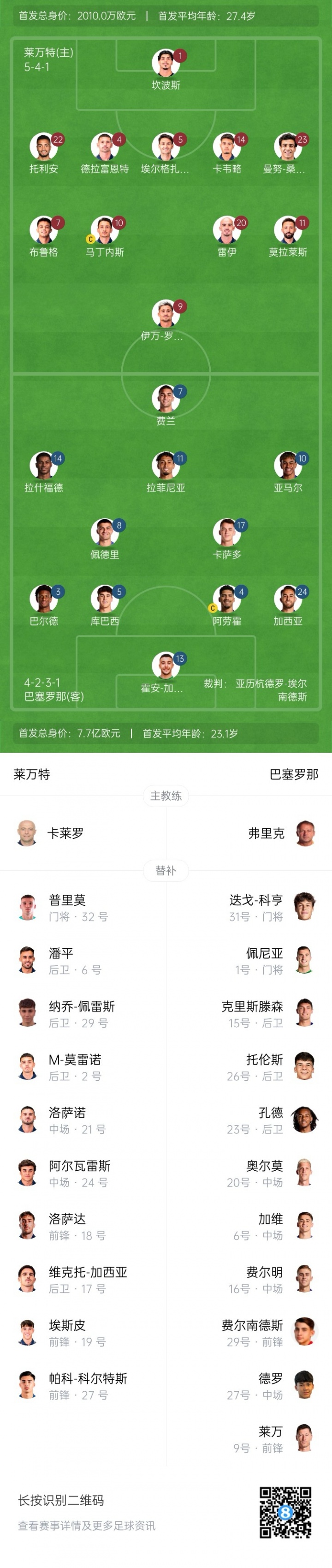 巴萨替补:1-佩尼亚、31-科亨、6-加维、9-莱万、15-克里斯滕森、16-费尔明、20-奥尔莫、23-孔德、26-托伦茨、27-德罗、29-托尼-费尔南德斯