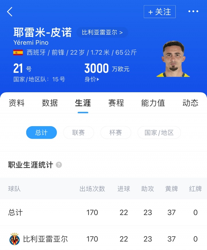 皮诺现年22岁,西班牙籍先锋。他在上赛季为比利亚雷亚尔出场35次,取得4粒进球和9次助攻。现在其德回身价预估3000万欧元。