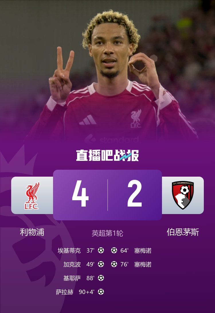 英超第一轮,利物浦4-2伯恩茅斯,基耶萨88分钟绝杀,萨拉赫94分钟锁定胜局!