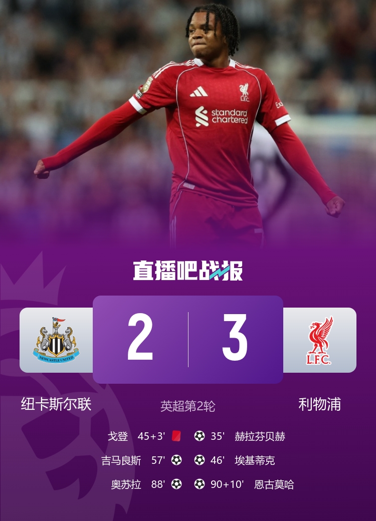 英超第2轮,纽卡斯尔2-3利物浦!恩古莫哈100分钟绝杀!