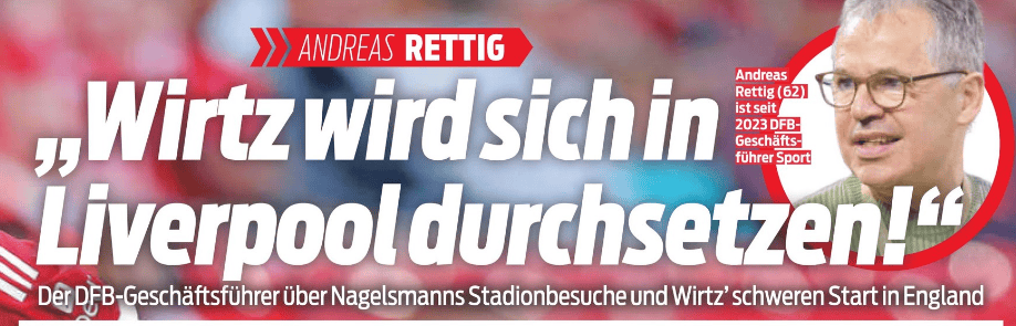 雷蒂格: 德国承担不起更多失利;维尔茨会在利物浦讲明我方