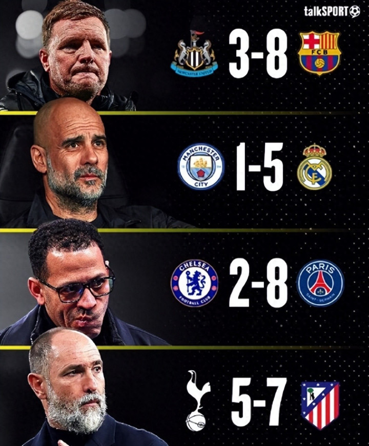 切尔西和曼城的出局就极其损害英超的颜面了,切尔西主客场对决均以3球的差距被巴黎双杀。过去4年,切尔西是足坛花费最多的足球球队组织,但被巴黎2-8横扫真是颜面尽失,次回合在斯坦福桥嘘声吹给了蓝军。
