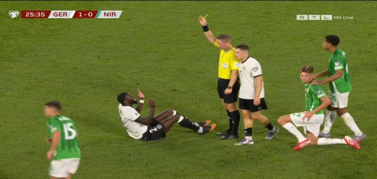 吕迪格被敌手撞倒在地,但被吹罚为抵牾犯规,下轮德国主场对阵卢森堡时将累计黄牌停赛。